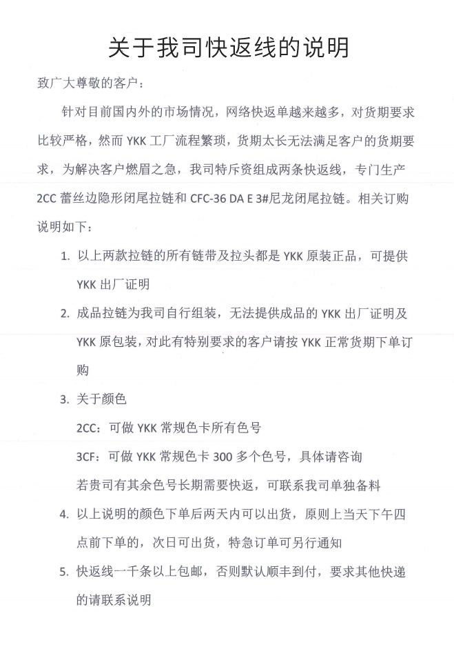 關(guān)于我司快返線的說(shuō)明
